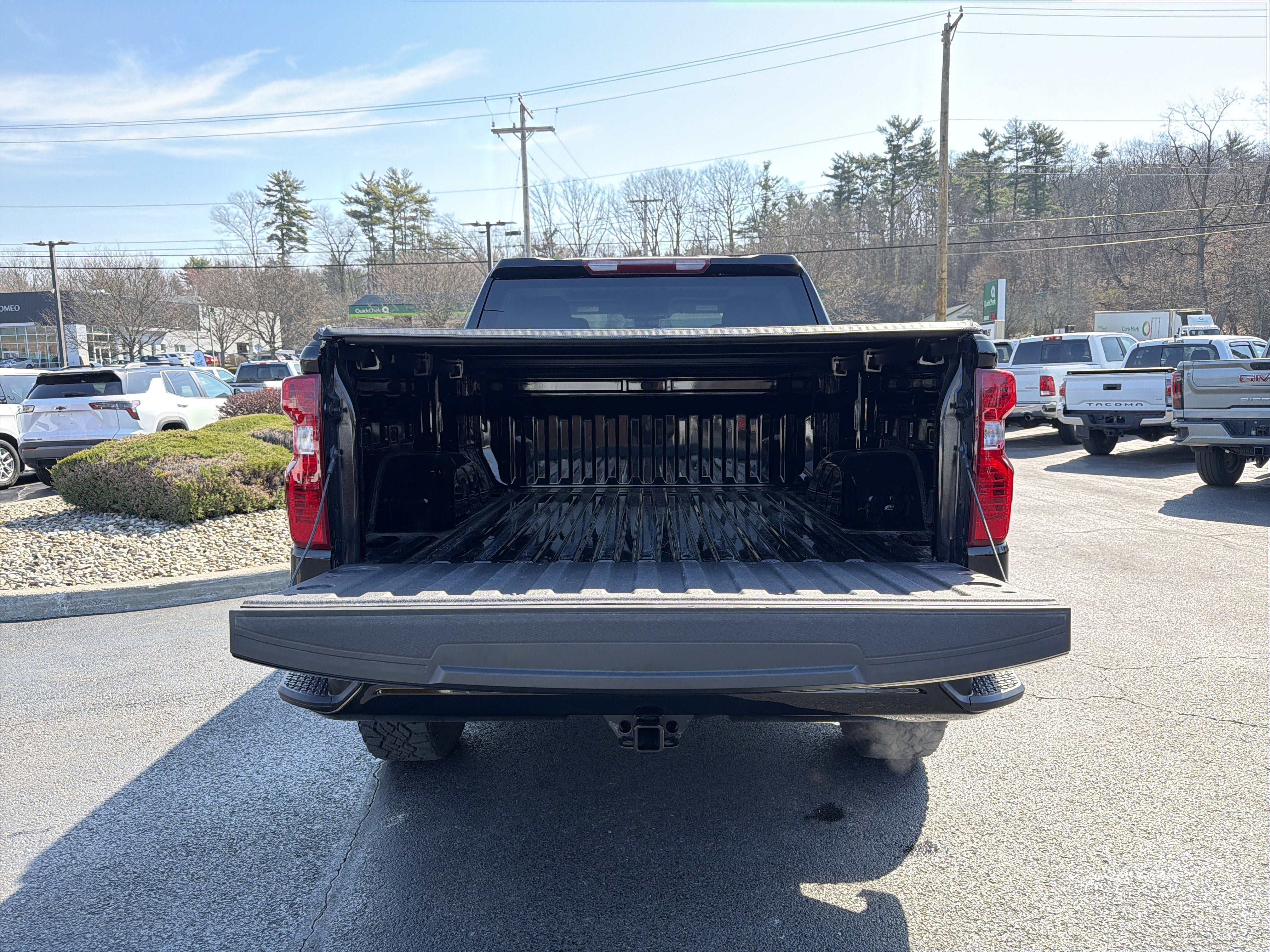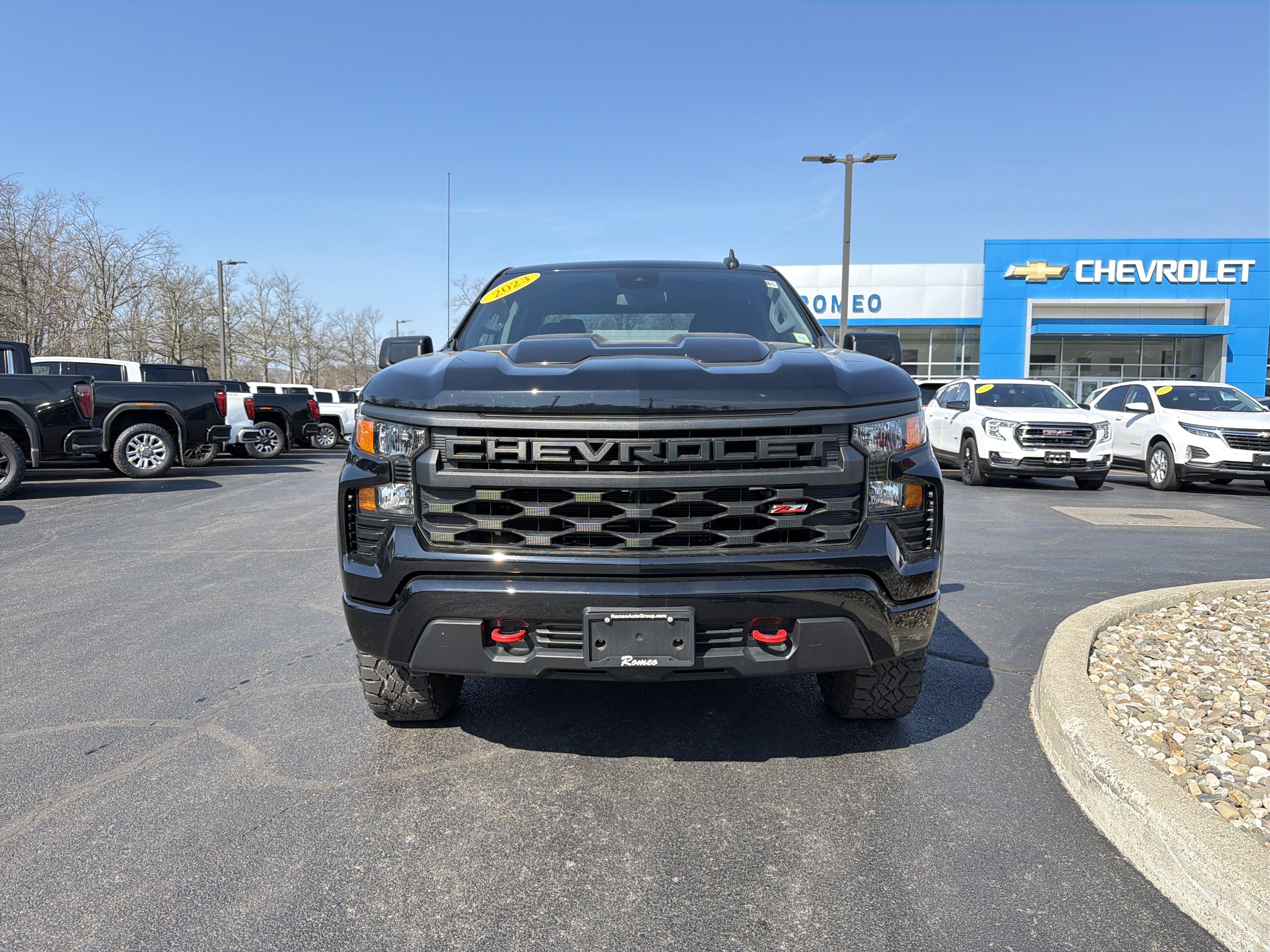 New Price! Romeo GM Center Proudly presents this 2023 Chevrolet Silverado 1500 with Custom Convenience Package (Electric Rear-Window Defogger, EZ Lift Power Lock & Release Tailgate, LED Cargo Area Lighting, Remote Vehicle Starter System, and Theft Deterrent System (Unauthorized Entry)), Preferred Equipment Group 2CX (10-Way Power Driver Seat w/Lumbar, 120-Volt Bed Mounted Power Outlet, 120-Volt Instrument Panel Power Outlet, 3.5" Monochromatic Display Driver Info Center, Auto-Locking Rear Differential, Bluetooth® For Phone, Chevrolet Connected Access Capable, Color-Keyed Carpeting Floor Covering, Compass, Deep-Tinted Glass, Dual Rear USB Ports (Charge Only), Electrical Steering Column Lock, Electronic Cruise Control, Front Rubberized Vinyl Floor Mats, HD Rear Vision Camera, Manual Tilt Wheel Steering Column, OnStar & Chevrolet Connected Services Capable, Performance Red Recovery Hooks, Power Front Windows w/Driver Express Up/Down, Power Front Windows w/Passenger Express Down, Power Rear Windows w/Express Down, Rear 60/40 Folding Bench Seat (Folds Up), Rear Rubberized-Vinyl Floor Mats, Remote Keyless Entry, SiriusXM Radio, Standard Tailgate, Wi-Fi Hot Spot Capable, and Wireless Phone Projection), Suspension Package (Heavy-Duty Air Filter and Hill Descent Control), Trailering Package (Hitch Guidance), 220 Amp Alternator, 3.42 Rear Axle Ratio, 4-Wheel Disc Brakes, 40/20/40 Front Split-Bench Seat, 6 Speakers, 6-Speaker Audio System, ABS brakes, Air Conditioning, Alloy wheels, AM/FM radio: SiriusXM, Apple CarPlay/Android Auto, Auto High-beam Headlights, Automatic Emergency Braking, Brake assist, Cloth Seat Trim, Delay-off headlights, Driver door bin, Driver vanity mirror, Dual front impact airbags, Dual front side impact airbags, Electronic Stability Control, Following Distance Indicator, Forward Collision Alert, Front anti-roll bar, Front Center Armrest w/Storage, Front License Plate Kit, Front Pedestrian Braking, Front reading lights, Front wheel independent suspension, Fully automatic headlights, Heated door mirrors, Illuminated entry, IntelliBeam Automatic High Beam On/Off, Lane Keep Assist w/Lane Departure Warning, Low tire pressure warning, Not Equipped w/Functional Cab & Bed Power Outlets, Not Equipped w/Rear USB Ports, Not Equipped w/Steering Column Lock, Occupant sensing airbag, Off-Road Assist Steps (LPO), Outside temperature display, Overhead airbag, Overhead console, Panic alarm, Passenger door bin, Passenger vanity mirror, Power door mirrors, Power driver seat, Power steering, Power windows, Premium audio system: Chevrolet Infotainment 3, Radio data system, Radio: Chevrolet Infotainment 3 System, Rear reading lights, Rear step bumper, Rear window defroster, Remote keyless entry, Security system, Speed control, Speed-sensing steering, Split folding rear seat, Tachometer, Tilt steering wheel, Traction control, Trip computer, Variably intermittent wipers, Voltmeter, and Wheels: 18" x 8.5" Black Painted Aluminum.Black 2023 Chevrolet Silverado 1500 Custom Trail Boss 4WD 8-Speed Automatic 2.7L Turbo